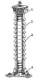 Розрядників РВС складається з блоку багаторазових іскрових проміжків (1) і робочих нелінійних резисторів (2), укладених в герметично закритому фарфоровому покришці (3).